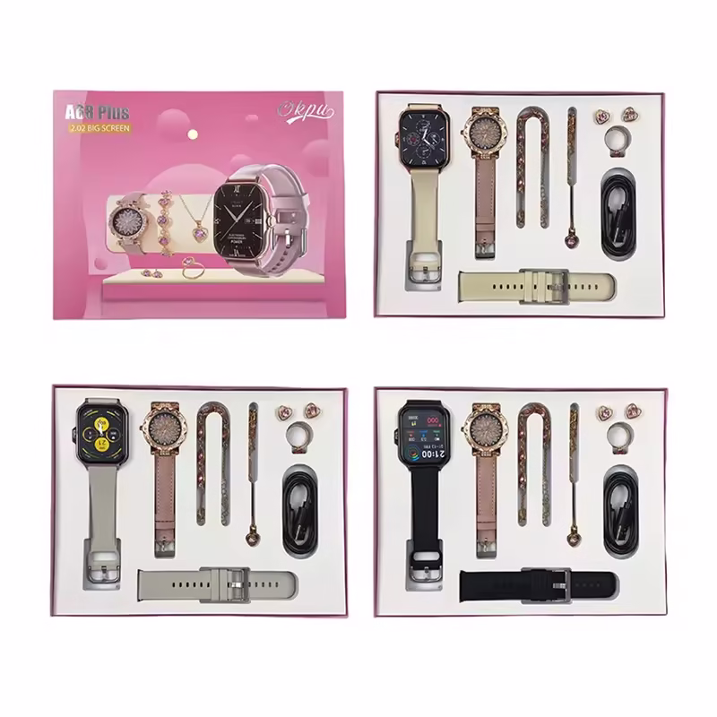 The 7-in-1 A68 Plus Smart Quartz Watch Combo offers a complete luxury experience, combining two stunning smart watches with a matching earring and necklace set. Each smart watch features a 2.02-inch vibrant display, customizable watch faces, and advanced features such as fitness tracking, heart rate monitoring, and sleep analysis to keep you connected and healthy. The combo set is designed for women, ensuring both practicality and elegance. The included earring and necklace set enhances the overall look, making this combo perfect for both everyday wear and special occasions. Stay stylish and on top of your health with this all-in-one accessory package.