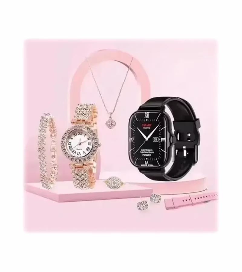 - 7-in-1 combo featuring two smart watches, earring, and necklace.
